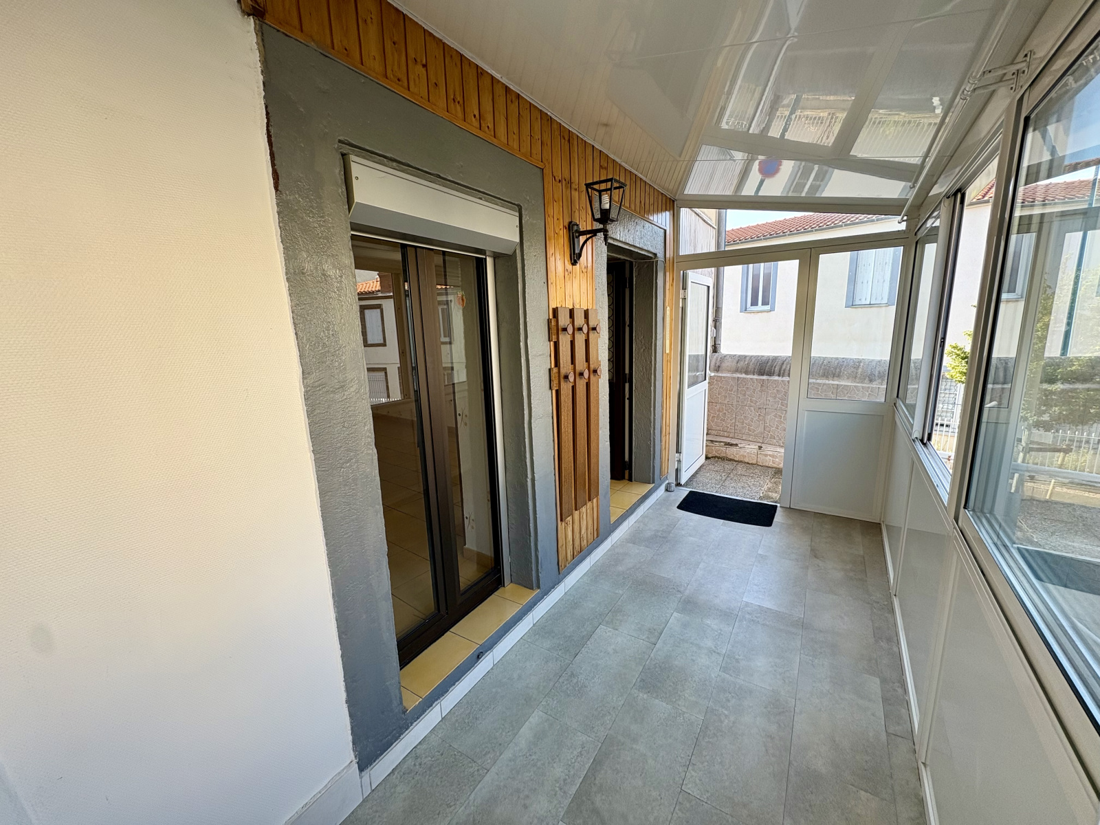 Elle se compose d'une véranda (6.85m²) qui donne sur une terrasse (49 m²), un salon séjour (16.07 m²), une cuisine (11.53 m²) et à l'étage une spacieuse chambre (15.64 m²), un bureau pouvant servir de chambre d'enfant d'environ (7.53 m²) et une salle de douche avec WC (4.03m²).